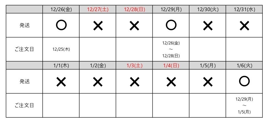 年末年始休業時の発送スケジュールについて いつもル クヴォン メゾン ド パルファムをご愛顧いただき誠にありがとうございます。年末年始休業時の発送スケジュールについてご案内申し上げます。 <年内最終出荷日>12月29日(月)※12月28日(日)23:59ご注文分まで <年始最短出荷日>1月6日(火)より順次対応 <オフィス休業日>2025年12月27日(土)~2026年1月4日(日) 尚、休業期間中にいただいたお問い合わせに関し、1月6日(火)以降順次対応をさせていただきます。 ご利用のお客様にはご不便をお掛けいたしますが、何卒ご理解のほどよろしくお願いいたします。今後とも、ル クヴォン メゾン ド パルファムをご愛顧のほどよろしくお願い申し上げます。 前のお知らせはありません 次のお知らせ 一覧へ戻る